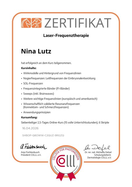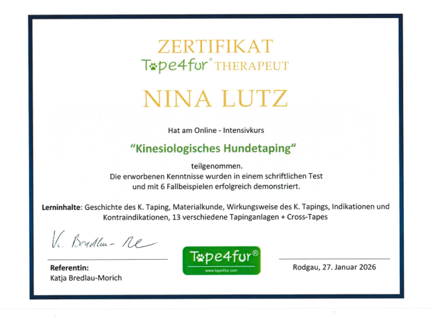 Nach meiner Ausbildung zur Hotelfachfrau und dem Studium der Wirtschaftspsychologie (B.Sc.) habe ich 2025 meinen Abschluss als Tierphysiotherapeutin absolviert und damit meine Berufung gefunden.
